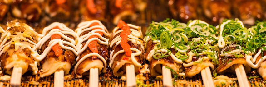오코노미야키를 젓가락에 돌돌말아 먹는 하시마키, 모치모치 튀김, 일본식과 서양식 퓨전음식 더블치즈 등.