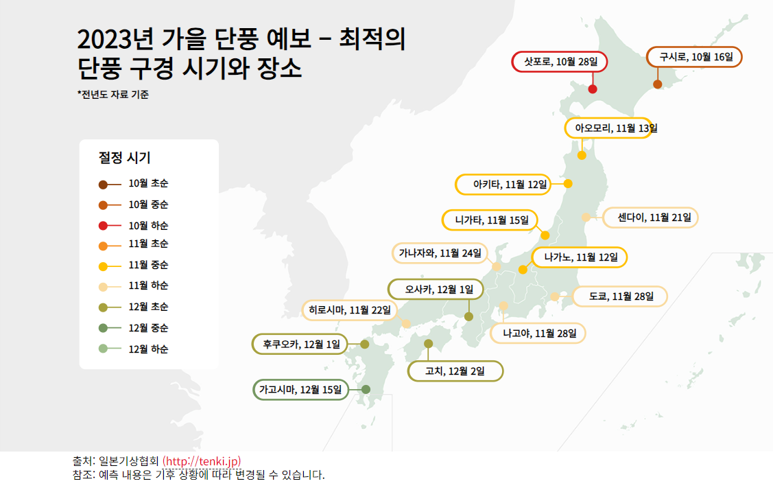 일본의 단풍은 10월 말에서 11월초까지가 절정입니다. 가시는 지역에 따라 차이가 있으니 잘 확인하시고 가시면 가을 축제와 함께 멋진 단풍을 구경하실 수 있습니다.